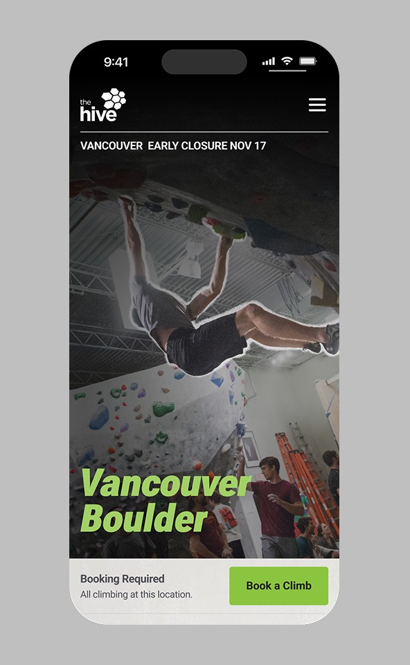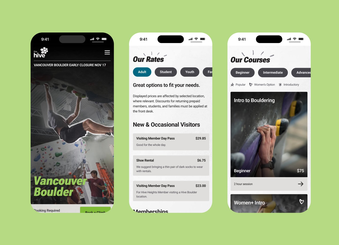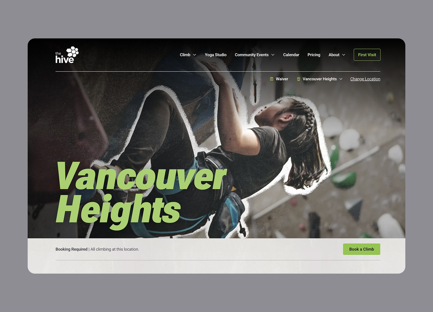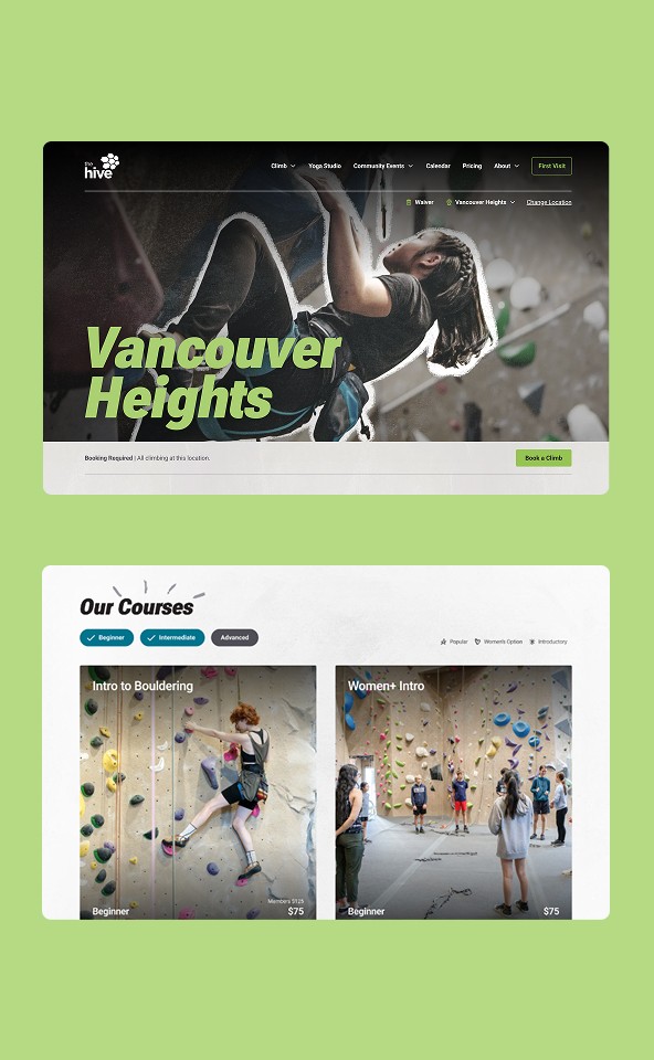 With an increase in climbing locations and programming across Canada, The Hive's website no longer met their needs. We were asked to redesign the site to be more mobile-friendly, prioritize the information users needed most and bring a bold new look to the visual design.